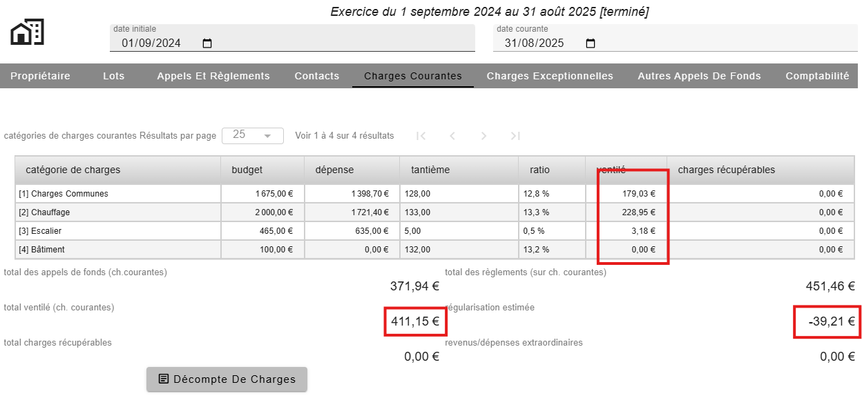 Dans l’application Syndic, pour un copropriétaire, dans l’onglet Charges courantes, le total ventilé ne correspond pas à la somme des totaux ventilés de chaque catégorie de charges (1 centime d’écart).