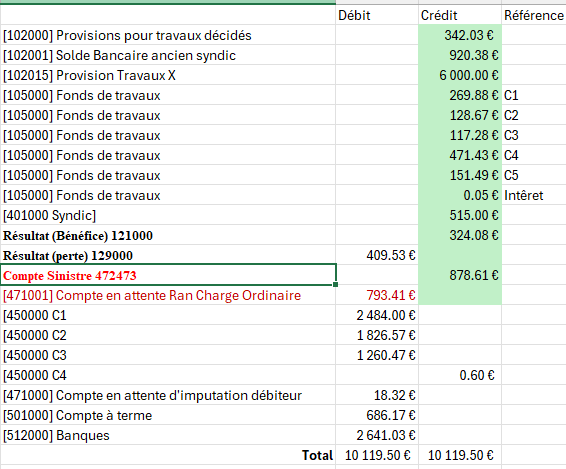 Comme j’avais le solde initial des copro à zéro, en parcourant le site, j’ai compris qu’il était nécessaire de créer des lignes d’écritures dans le journal de “report à nouveau”. la saisie de l’écriture dans mon journal “Report” était sans effet sur le solde initial. j’ai donc ressaisi toutes mes écritures de RAN dans ce journal et notamment sur le compte 450. mon solde initial par copro s’est trouvé correctement valorisé. Par contre, je ne peux plus créer d’appel de fonds je me retrouve avec le message " Impossible de supprimer…". Pour moi le problème est bien lié au journal de report à nouveau. il doit y avoir un compte qui pose problème. lequel … ? et difficile de débugger ! je ne peux même plus supprimer mes écritures de RAN et mes appel de fonds.